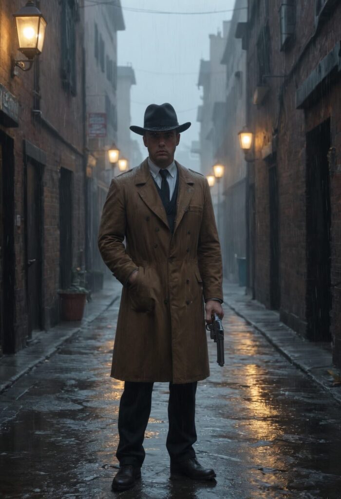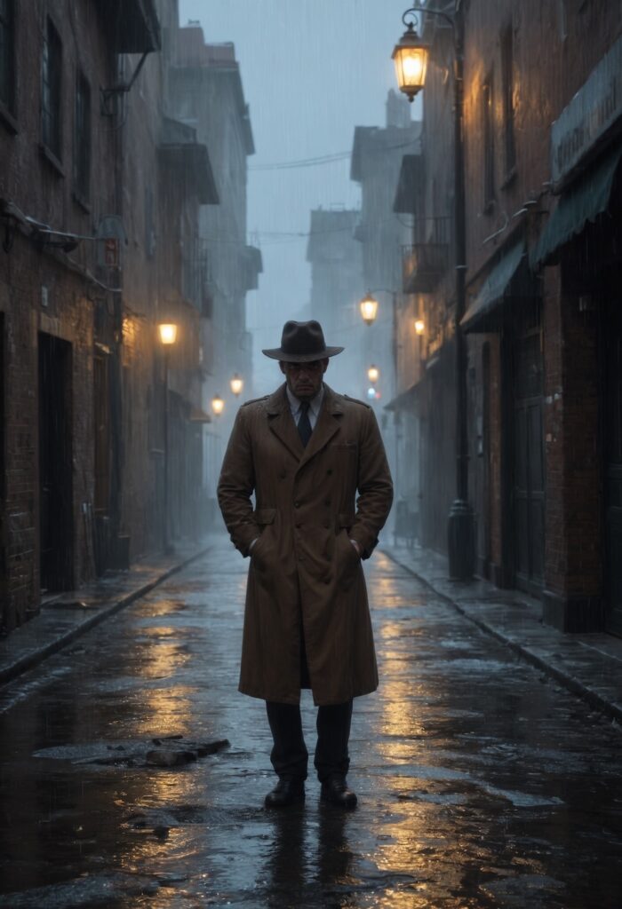 | 主題/場所 | a rugged male detective, standing in a dark, wet back alley, under the dim light of a street lamp, a neon sign is visible in the background | 雨で濡れた路地裏に刑事(男)を配置。街灯をメインの光源に設定し、背景にネオンサインを配置することで、サイバーパンク的なノワール感を加えます。 |