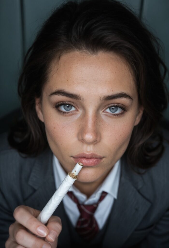 ポジティブプロンプト (masterpiece, best quality, ultra-detailed:1.2), RAW photo, cinematic film still, professional photography, a 40 year old detective, rugged face, deep-set eyes, sitting alone in a dim interrogation room, dramatic chiaroscuro, single light source from above, deep shadows obscuring the background, high contrast, moody lighting, pensive and contemplative mood, intensely focused, holding a cheap cigarette, smoke rising slowly, close-up portrait, 85mm lens, shallow depth of field, focused on the eyes