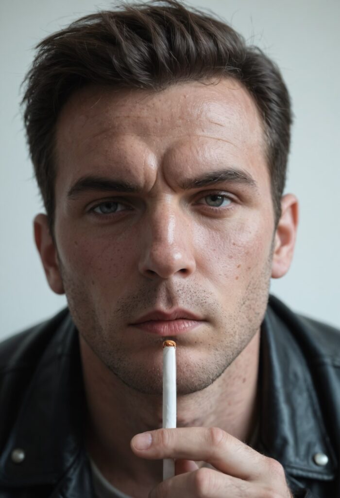 ポジティブプロンプト (masterpiece, best quality, ultra-detailed:1.2), RAW photo, cinematic film still, professional photography, a rugged male detective, a man, a determined gaze, 40 years old, deep-set eyes, wearing a worn leather jacket, stubble, deep facial lines, sitting alone in a dim interrogation room, dramatic chiaroscuro, single light source from above, deep shadows obscuring the background, high contrast, moody lighting, pensive and contemplative mood, intensely focused, sweat on his forehead, holding a cheap cigarette, smoke rising slowly, close-up portrait, 85mm lens, shallow depth of field, rim light accentuating the jawline, focused on the eyes