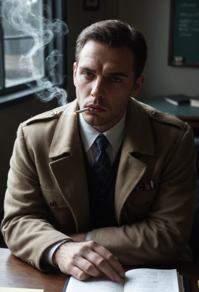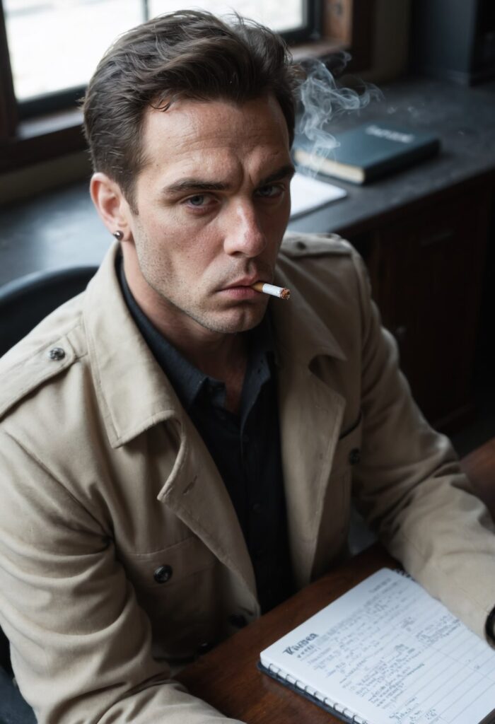 ポジティブプロンプト (masterpiece, best quality, ultra-detailed:1.2), RAW photo, cinematic film still, professional photography, a rugged male detective, a man, 40s, deep-set piercing eyes, stubble, deep facial lines, wearing a worn trench coat, (cynical expression:1.1), sitting in a gritty, smoke-filled interrogation room, (worn leather notebook and crumpled paperwork on the table:1.2), dramatic chiaroscuro, single light source from above, fluorescent lights reflecting off the table, deep shadows obscuring the background, high contrast, moody lighting, pensive and weary but determined, holding a cheap cigarette, smoke rising slowly, close-up portrait, 85mm lens, shallow depth of field, rim light accentuating the jawline, focused on the eyes