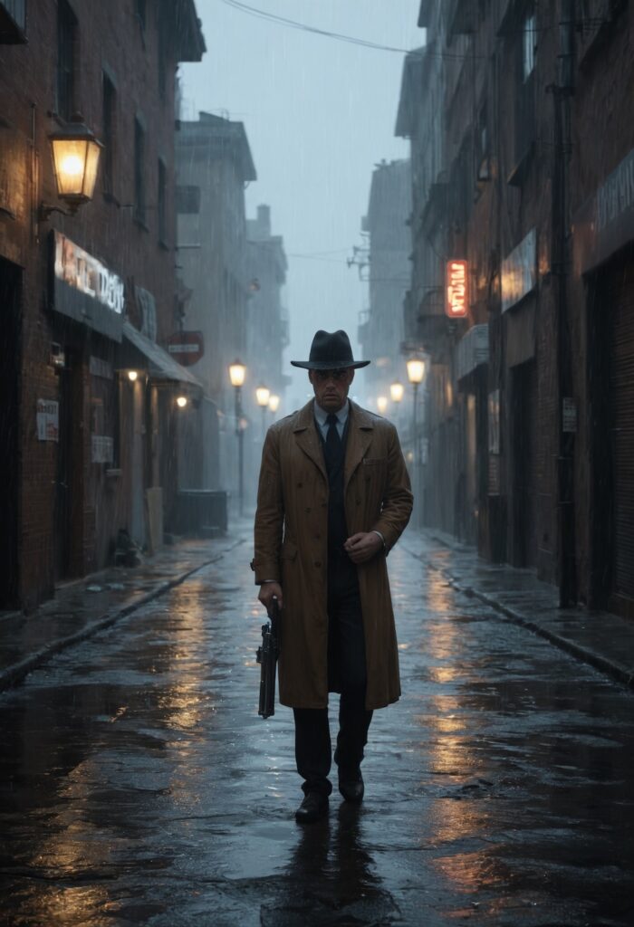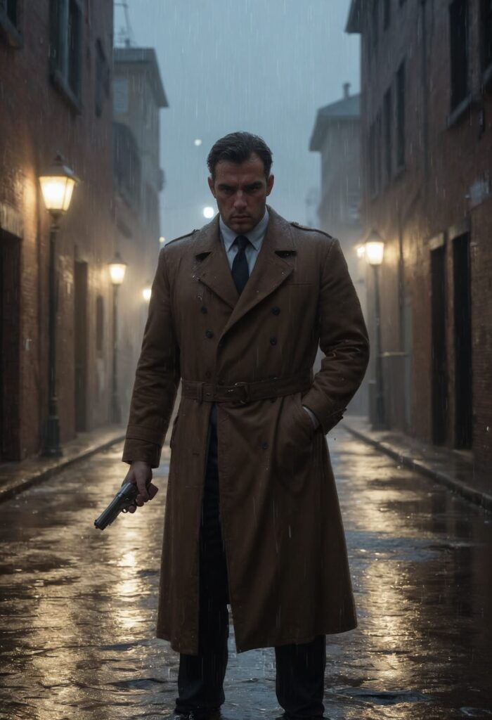 ポジティブプロンプト (masterpiece, best quality, ultra-detailed:1.2), RAW photo, cinematic scene, professional cinematography, high resolution, a rugged male detective, a man, 40s, deep-set determined eyes, stubble, wearing a wet trench coat, standing in a dark, wet back alley, under the dim light of a street lamp, a neon sign is visible in the background, dramatic volumetric lighting, strong rim light from the wet ground, rain falling, moody and foggy atmosphere, deep shadows, blue and orange color grading, cynical and weary expression, holding a revolver loosely, looking down at the ground, wide shot, low angle, cinematic aspect ratio, deep depth of field