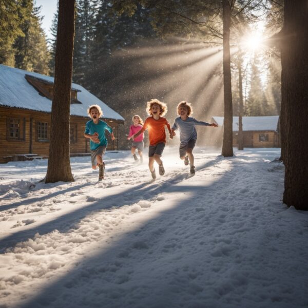2. 夏の暑い日差しの中でサマーキャンプを楽しむ子供たちの画像に雪を降らせる