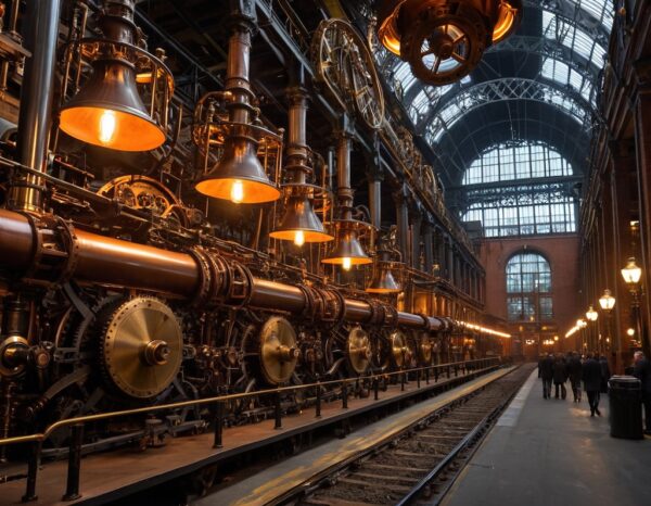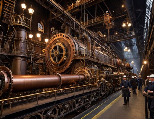 「静かな田舎の動力」から「轟音を立てる産業の心臓部」へですね!ここでは、「複雑さ」と「圧倒的な工業力」を強調します。プロンプトで歯車を「maze of massive, interlocking brass and copper gears」として描写し、工業の活気と火の光を強調します。