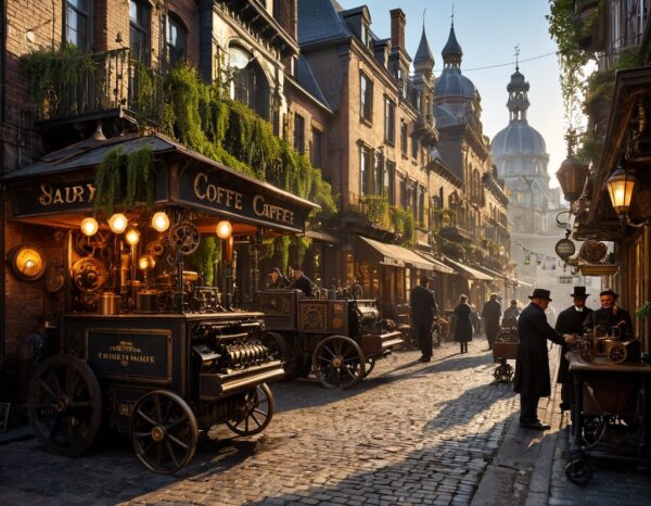 | ポジティブプロンプト | A breathtaking, highly detailed, cinematic, victorian steampunk cityscape. The city's foundations... are a dense, intricate network of colossal, interlocking brass and copper gears... Towering smokestacks, built from riveted steel and weathered brick, release thick plumes of dark smoke into a hazy, gaslamp-lit sky. Majestic, ornate Victorian-era buildings... The scene is bustling with life, with tiny figures of workers in period attire---top hats, waistcoats, and goggles... reminiscent of the Pax Britannica era. |
