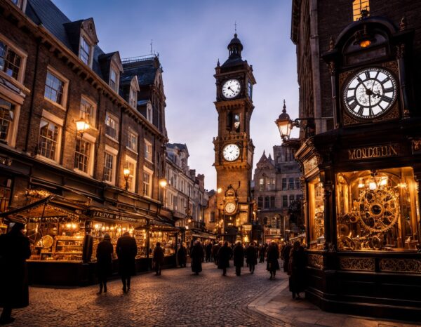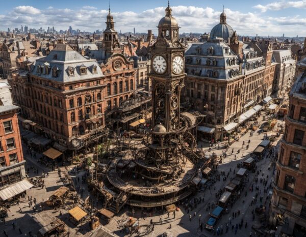 素晴らしいですね。この街の風景をさらにダイナミックにしたいです!街中の風景でありながら、「歯車産業のシンボル」として機能しているような構図をお願いします。具体的には、巨大な街中の時計が複雑な歯車を剥き出しにしたデザインで、広場の真ん中に佇んでいるような絵です。