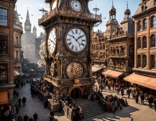 「ダイナミックな構図」と「シンボルとしての機能美」の融合ですね!巨大な時計を配置し、人々がその巨大な機構の周りで日常を送る情景を描写します。