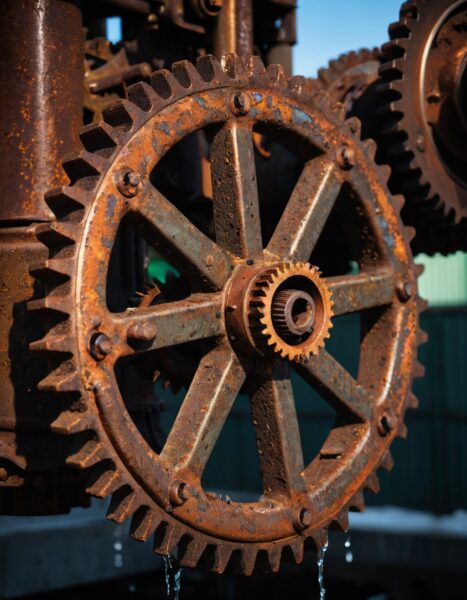 それは頼もしいですね!では、最初の画像はシンプルに「錆びた巨大な歯車のマクロショット」でお願いします。
