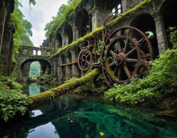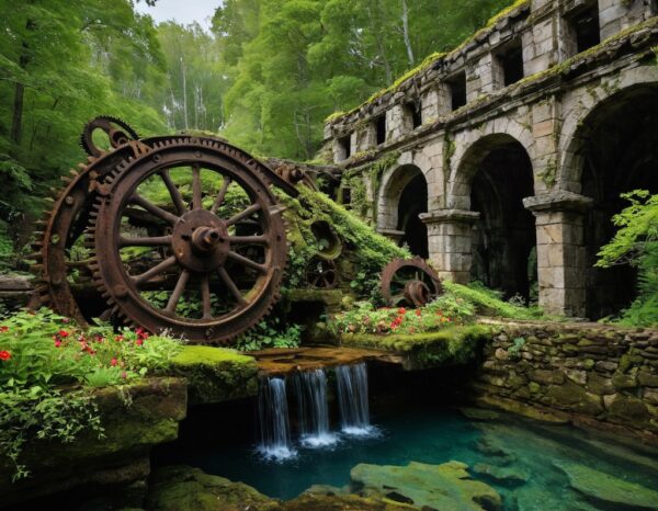 承知いたしました。歯車を「廃墟の残骸」から「生活の動力源」へと役割を変えるプロンプトに進化させましょう。歯車を「水車」として、具体的な「機能」を記述します。