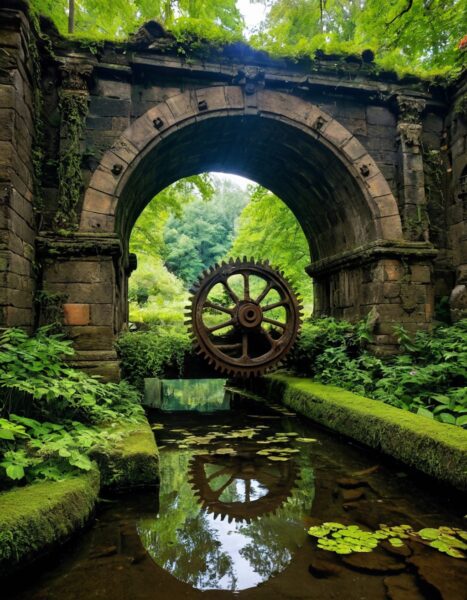 「ラピュタ」のような、自然に覆われた古代遺跡の歯車を主役にできますか?ネオン系やサイバーパンクなどの要素は不要です!