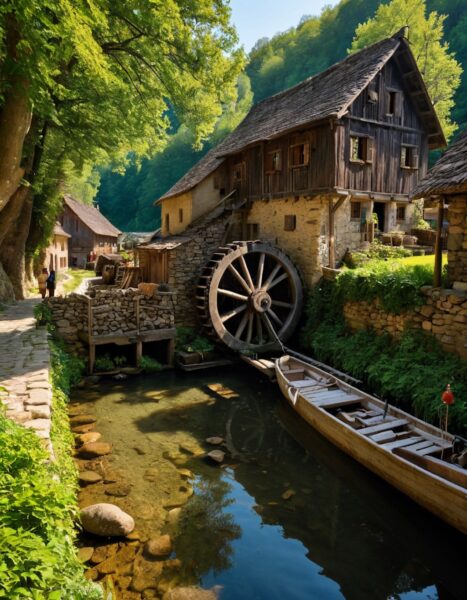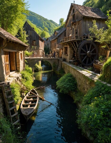 プロンプトでは、「wooden watermill, grinding wheat for the villagers(村人のために小麦を挽く水車)」や、「a woman hangs laundry, a man fishes from a small boat(女性が洗濯物を干し、男性が小舟から釣りをする)」といった、具体的な生活の動詞を組み込みます。