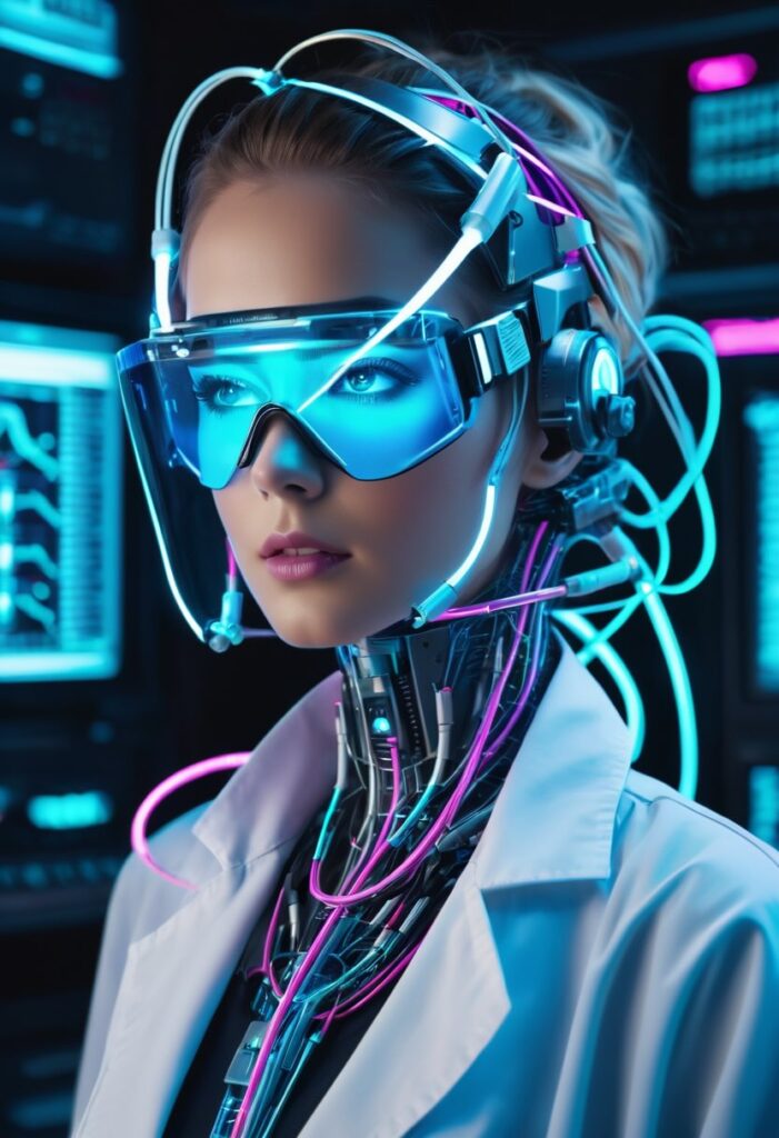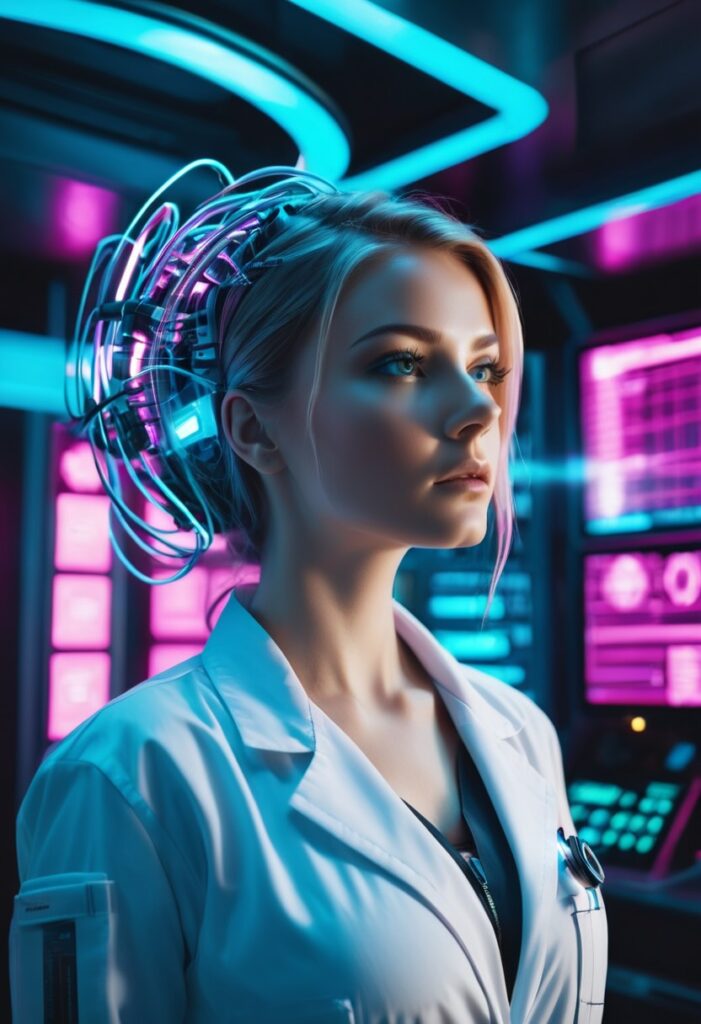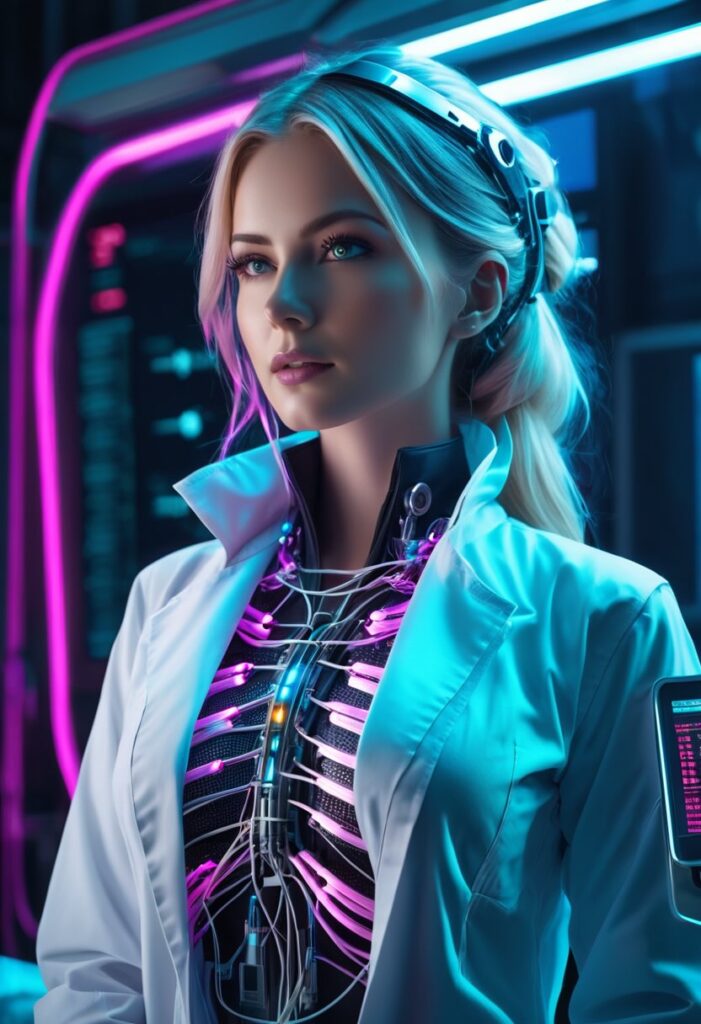 この新しいプロンプトは、光のドラマチックさは保ちつつ、医者としての専門性とサイバーパンクの科学的側面を強調し、牧師に見える要素を徹底的に排除しました。