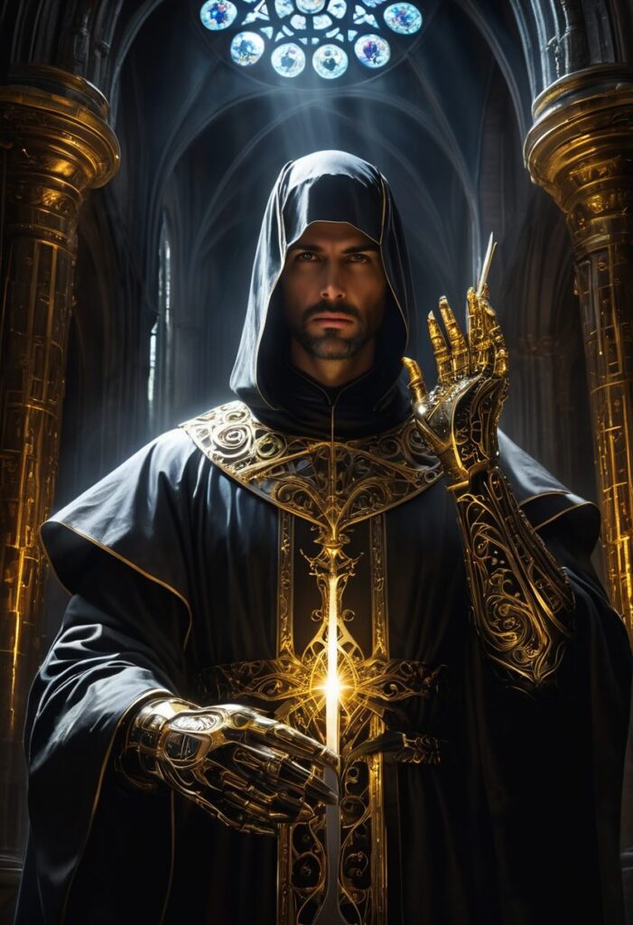 (masterpiece, hyper-detailed:1.3), RAW photo, cinematic composition, (Baroque oil painting style), A determined cybernetic surgeon, wearing a dark medical gown, holding a (glowing futuristic scalpel:1.2), (full cybernetic arm with intricate gold filigree:1.2), intense focused look, a look of solemn, intense focus, pensive and contemplative mood, standing in a dark, ruined Gothic cathedral operating room, ancient stone, (light filtering through fractured stained glass:1.2), volumetric fog, deep oppressive shadows, (tenebrosm, dramatic chiaroscuro:1.4), single light source from above, (divine light ray:1.3) casting long shadows, ethereal glow on face