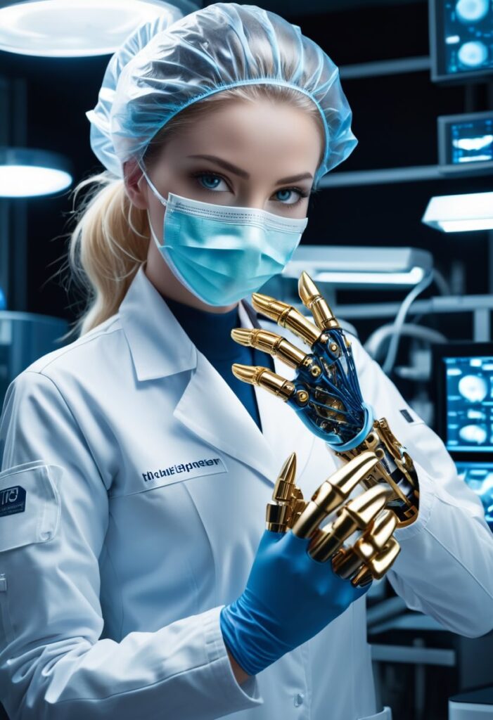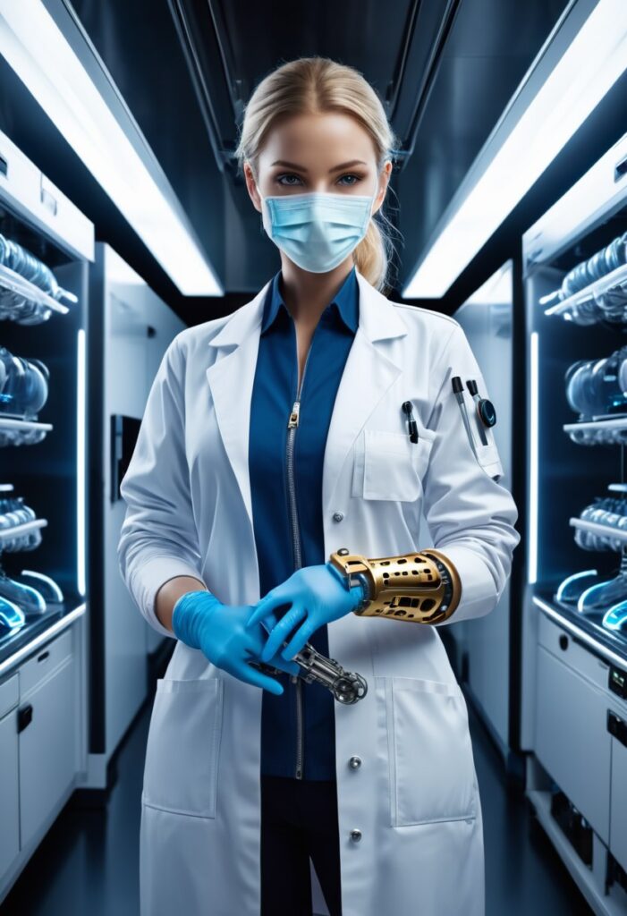 「義体ドクター」として、医療行為を行うための権威性、専門性、そして使命感を画像に持たせるために、プロンプトに以下の要素を具体的に追加・調整しましょう!