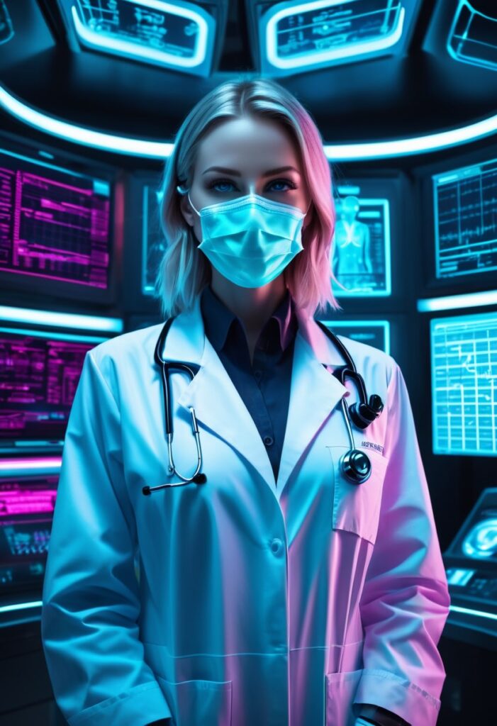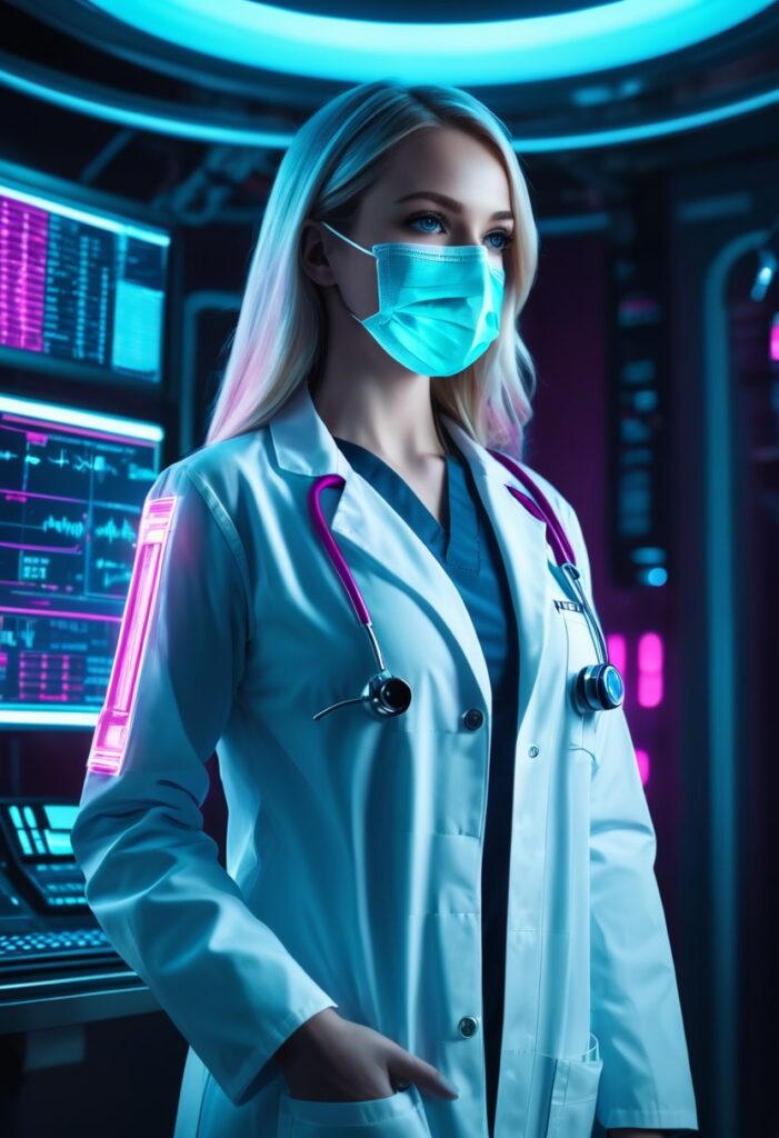 | 服装 | long white lab coat (or dark blue medical uniform), (glowing stethoscope), data pad in hand | 白衣や濃い色の医療ユニフォーム、そして未来的な聴診器やデータパッドを加えることで、 一目で医療従事者だと認識させます。 |