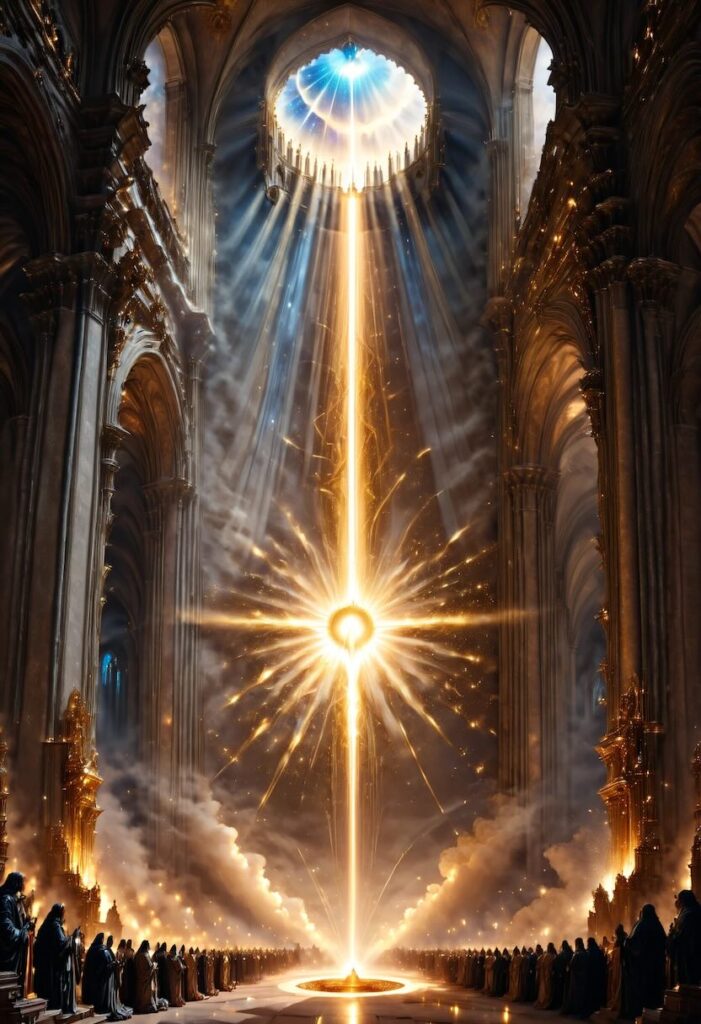 - コンセプト設計: 「目に見えない存在から発せられる圧倒的な光が、埃の舞う聖堂を浄化するシーン」を想定する。