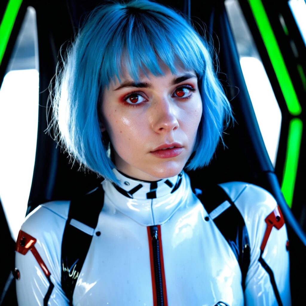 綾波レイの再現においては、アニメ的な記号を物理的なマテリアル(ラテックス、アルビノの特徴、フィルムの質感)へと翻訳するプロンプトエンジニアリングが成功の鍵となる。青い髪と赤い瞳という非現実的な要素を、フォトリアリズムの文脈で説得力を持って提示するためには、照明設計とカメラ設定(被写界深度、レンズミリ数)の指定が不可欠である。