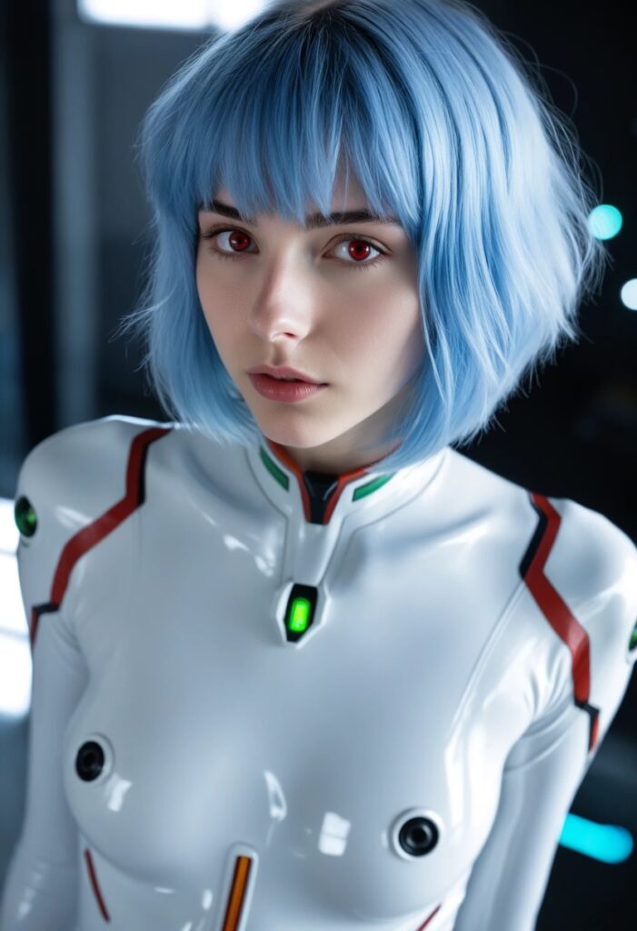 masterpiece, best quality, amazing quality, very aesthetic, absurdres, ultra-detailed, 8k raw photo, photorealistic, realistic, 1girl, solo, ayanami rei (neon genesis evangelion), beautiful young woman, 19-21 years old, ethereal beauty, (pale blue short bob hair:1.28), silky fine hair, soft messy bangs, delicate hair strands with subtle sheen, (translucent crimson red eyes:1.35), large expressive eyes, detailed iris with soft light reflections, long eyelashes, melancholic yet captivating gaze, (perfect delicate face:1.3), small nose, soft lips, pale porcelain skin, flawless yet realistic skin texture, (detailed skin:1.35), visible fine pores, subtle vellus hair, faint natural blush, soft glowing skin, delicate collarbone, (wearing tight white latex evangelion plugsuit:1.25), glossy reflective surface, realistic latex texture, tight fit on slender body, intricate mechanical details, glowing green interface accents, armored headset, inside dark sci-fi entry plug, biomechanical interior, floating LCL bubbles, moody volumetric lighting, soft rim light highlighting face and body curves, cinematic shadows, depth of field, beautiful bokeh, shot on Fujifilm XT3 or Sony A7R IV, 85mm f/1.8 lens, film grain, natural skin sheen, delicate sweat droplets, looking at viewer, intense yet soft and beautiful gaze, slight head tilt, ethereal and captivating beauty