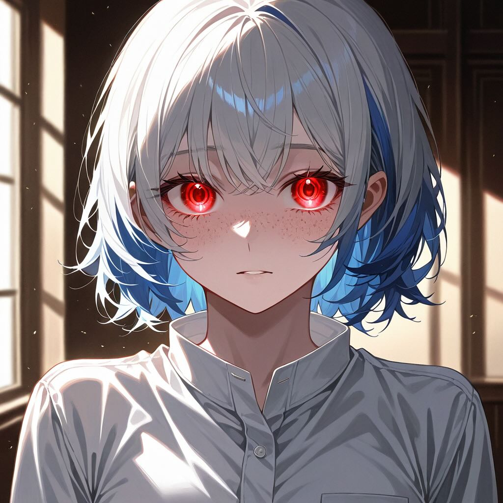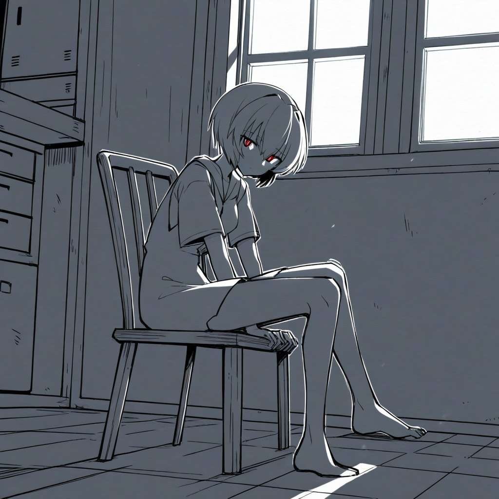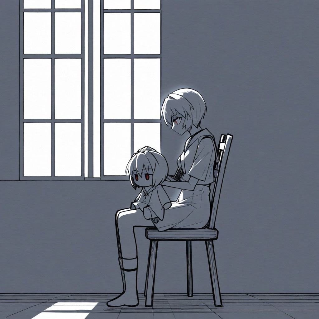 - コンセプト: 綾波レイの「人形」としての側面と、その内面に芽生える人間性の葛藤を、一枚のスケッチに凝縮する。彼女は古い木製の人形椅子に座り、その身体の一部はまだ未完成のデッサン人形のように、構造線が見えている。光と影のコントラストが、その無機質さと有機質さの境界を曖昧にする。