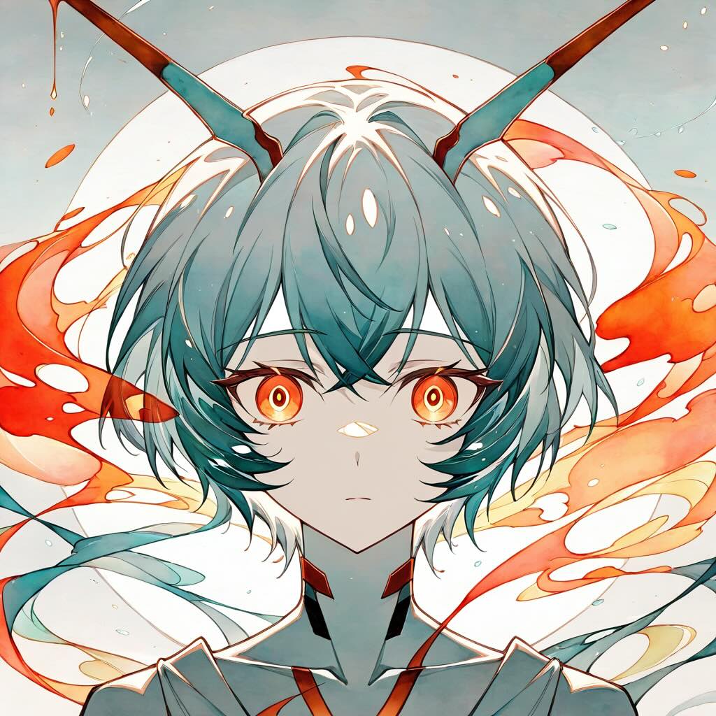 [a detailed portrait of ayanami rei... : her body dissolving into a swirling sea of orange LCL and light particles : 0.5]という記述により、AIはまず綾波レイの肖像画の構図を作り、プロセスの50%地点から、その構図をLCLの海へと溶け込ませるディテールを描き始めます。これにより、静止画でありながらダイナミックな変容を感じさせる、シュールで象徴的なアートが生まれます。 - プロンプト: