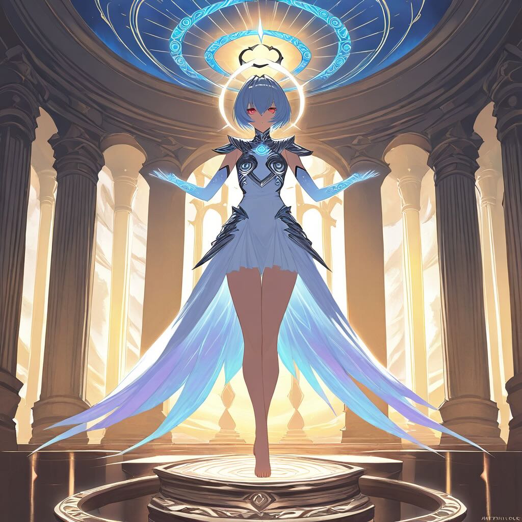 - コンセプト: 綾波レイを異世界の「沈黙の神託者」として再創造する。彼女の神聖さを、背後に顕現する巨大な光輪(Halo)と、天から降り注ぐ神の光線(God Rays)によって視覚的に表現する。優雅なS字曲線のポーズと、光るルーン文字が刻まれた鎧で、キャラクターの魅力を最大限に引き出す。
