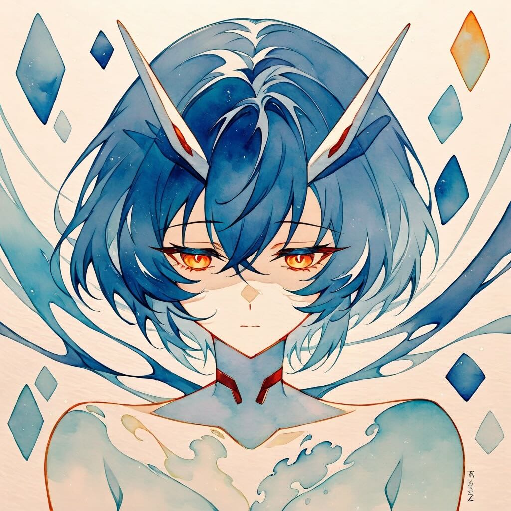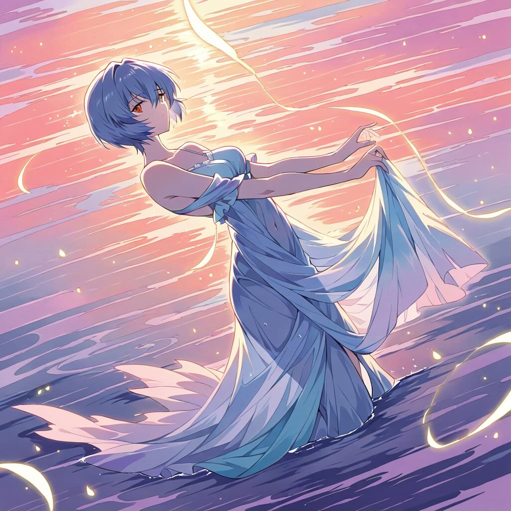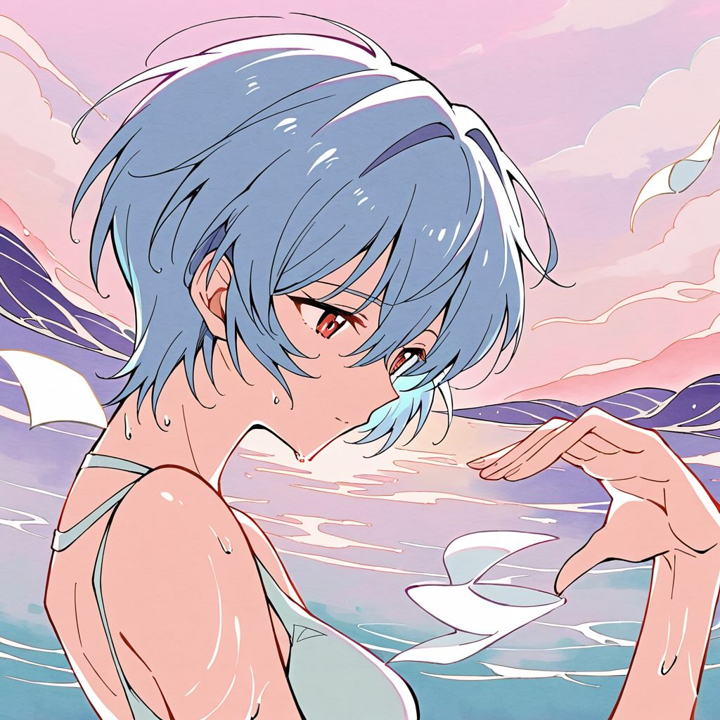 - コンセプト: 彼女の儚さと、LCLの海との親和性を、水彩特有の「にじみ」と「透明感」で表現する。綾波レイが水面に浮かび、彼女の身体と水面、そして反射する空の境界が溶け合っていく、幻想的で詩的な瞬間を捉える。