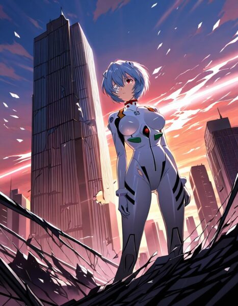 - コンセプト: 廃墟と化した都市で、最後の夕陽を背に静かに佇む綾波レイ。その姿にバロック絵画の光と影のドラマ(キアロスクーロ)を取り入れ、英雄的な孤独感と終末的な美しさを極限まで高める。鑑賞者の視線を強制的に引きつけ、感情に訴えかける一枚を目指す 12。