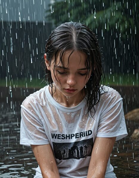 映画のワンシーンのような、物語性を感じさせるフォトリアルな作品を目指します。今回はR-15指定として、雨に濡れた制服が肌に張り付き、体のラインや下着が透けて見えるような、少し大人びたセクシーな表現に挑戦します。