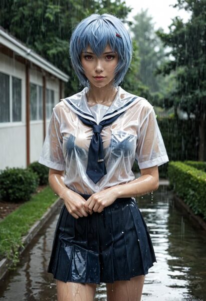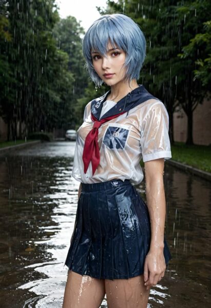 RAW photo, (1girl, ayanami rei, 18 years old, blue hair, red eyes), wearing (wet school uniform:1.4), (see-through fabric:1.2), (underwear visible through wet clothes:1.2), (body silhouette visible:1.2), clinging to her skin, standing in the rain, (looking at viewer, melancholic expression:1.1), cinematic lighting