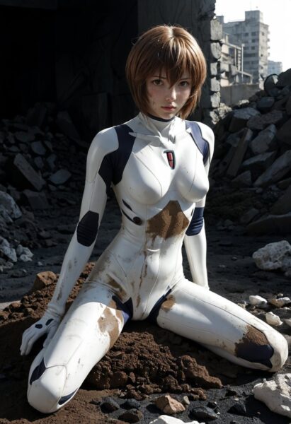 - wearing a (white plugsuit stained with dirt and grime:1.3): 「泥や汚れで汚れた白いプラグスーツ」というキーワード。激しい戦いを乗り越えた後を想像させ、物語性を深めます。汚れによって状況を表現するのがポイントです。
