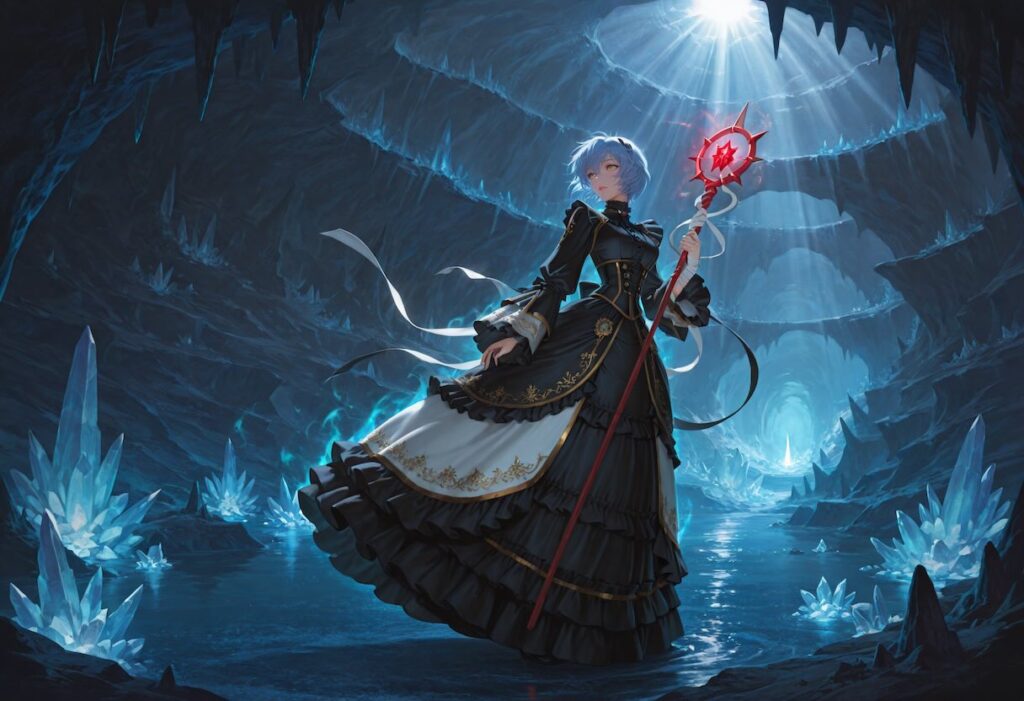 コンセプト: 異世界転生した綾波レイ。ダークファンタジーの表紙風。