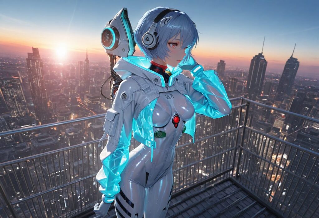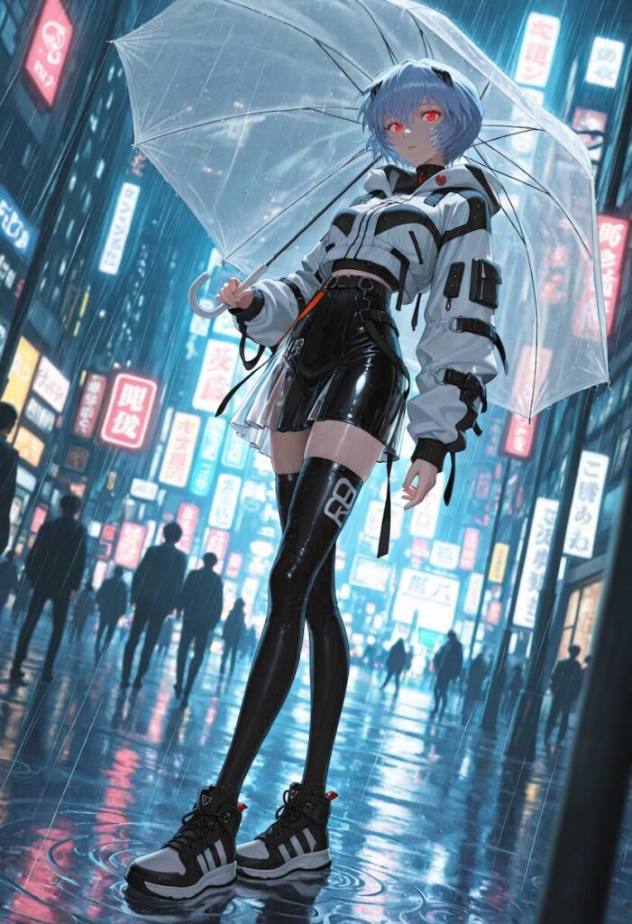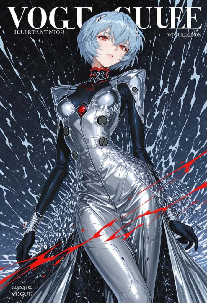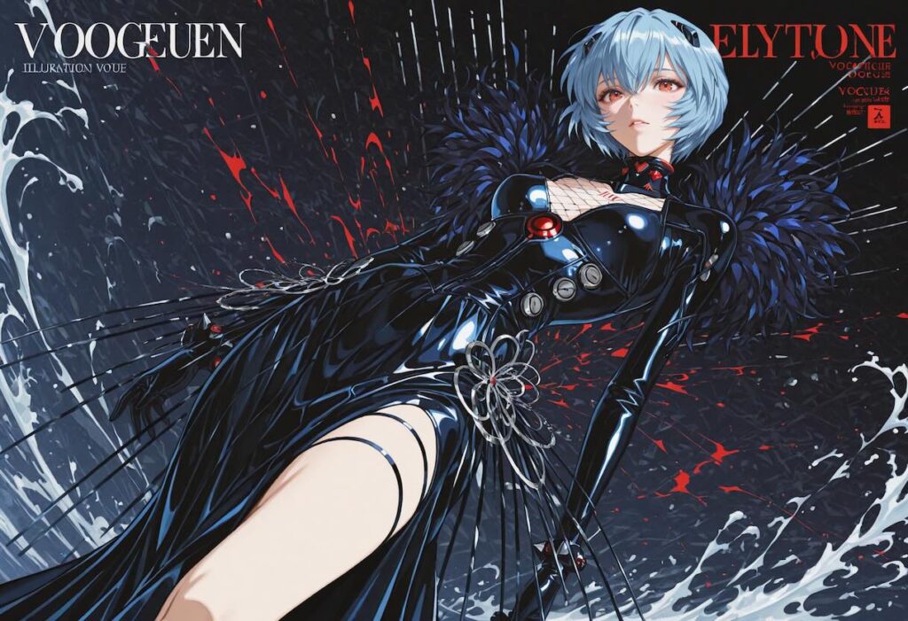 解説: avant-gardeやmixed mediaで通常のイラストの枠を破壊する。色彩をあえて制限(monochrome with spot color)することで、綾波レイのアイコニックな「青」と「赤」を際立たせ、アートとしての強度を高める。