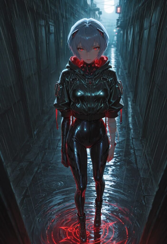 解説: low key lighting と chiaroscuro で画面の大半を闇に沈め、rim lighting(輪郭光)とbioluminescence(生物発光的な輝き)で綾波のシルエットを浮かび上がらせる。Nova Orange XLのダイナミックレンジを限界まで活かした設定。