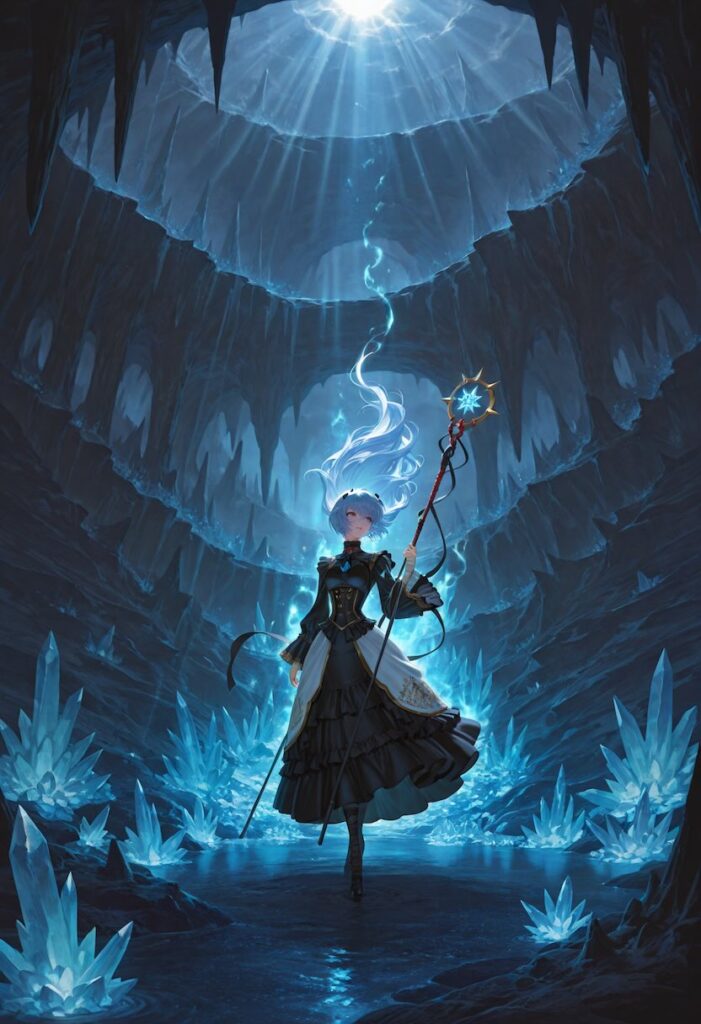 floating in a crystal cave, underground lake, glowing blue crystals, magical aura, casting a spell,