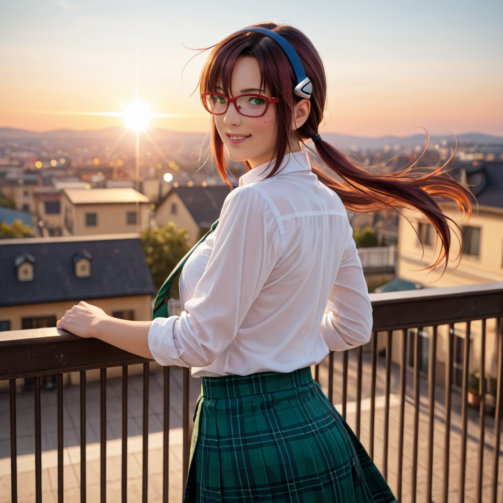 「もしマリが現実にいたら」という仮定に基づくポートレート。制服姿で第3新東京市(あるいは現代の東京)の屋上に佇む、プライベートな瞬間を切り取る。
