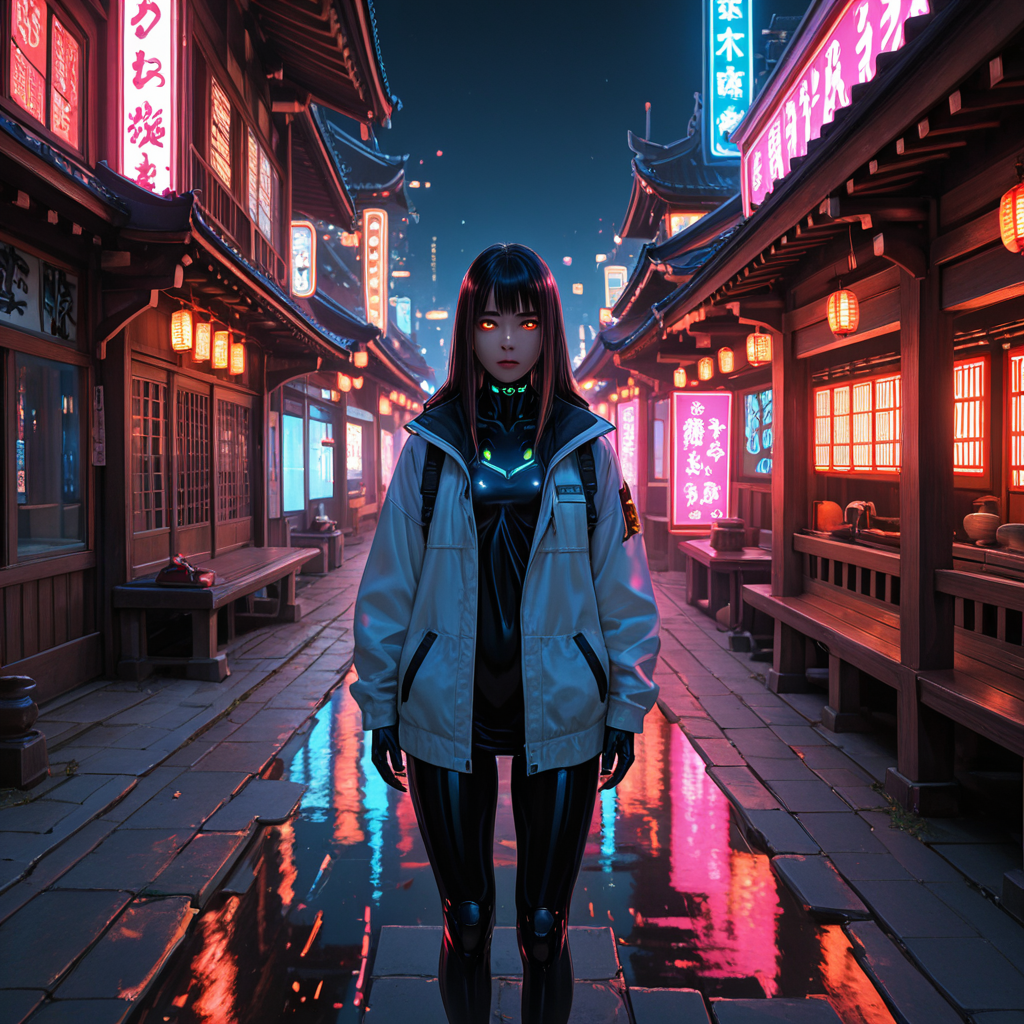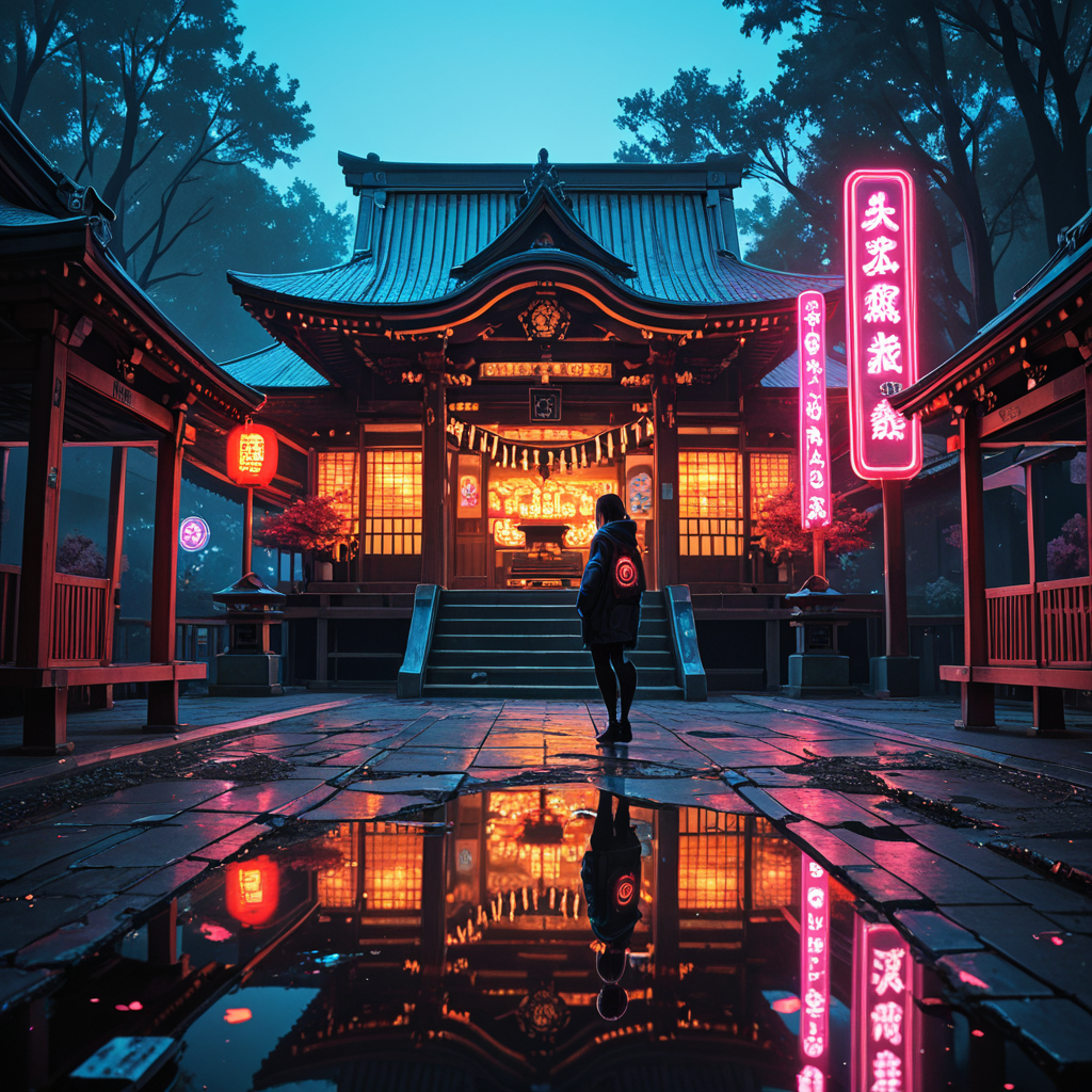 - ææ³: glowing, neon lights, cyberpunk, japanese shrine, reflectionã