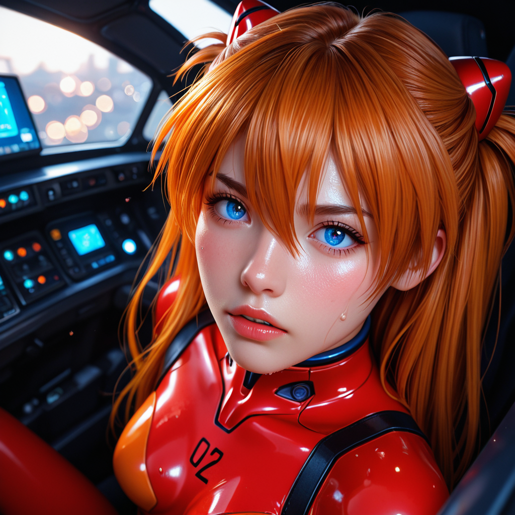 dynamic pose, sitting in entry plug, cockpit interior, mechanical details, sci-fi aesthetics, metal texture, cables,