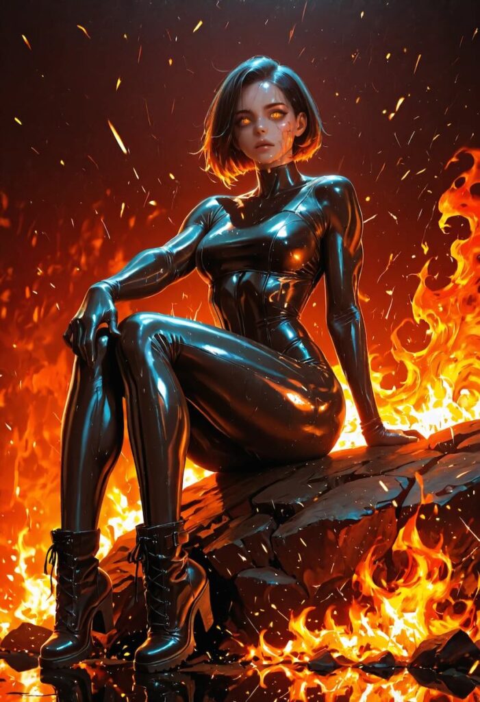 コンセプト: 炎の中のアンドロイド。耐火スキンの光沢と炎の照り返し(リフレクション)を強調し、VFXを使った実写映画のようなルックを目指します。