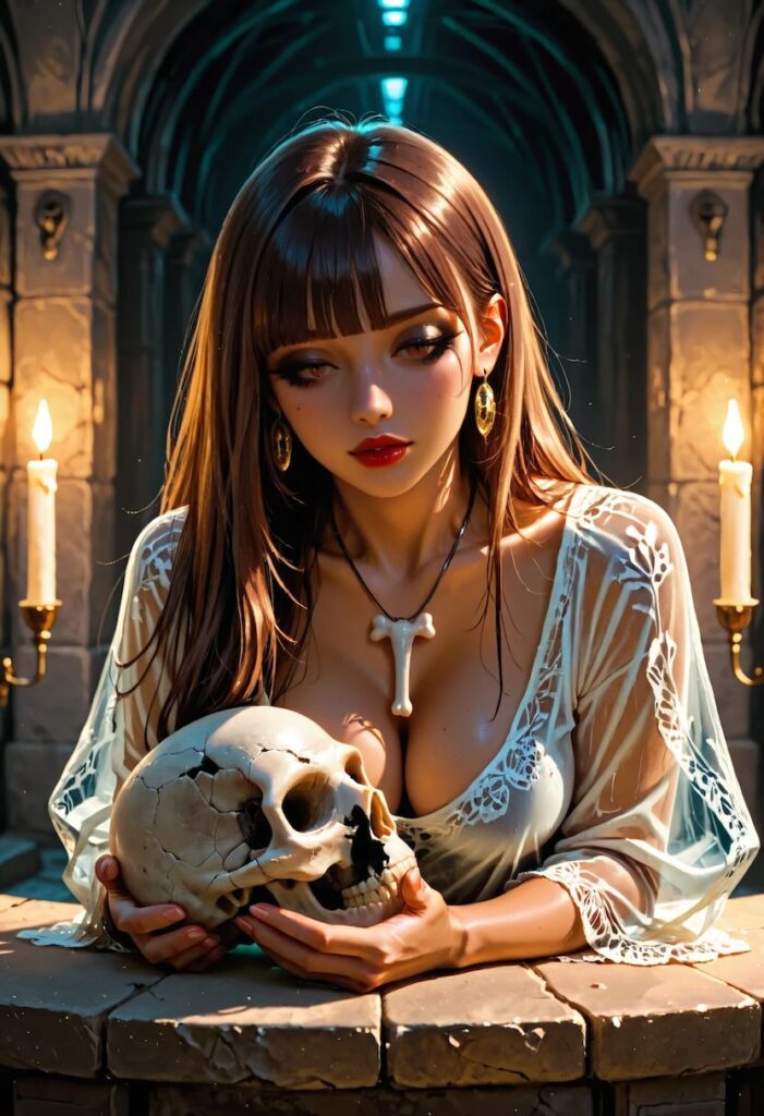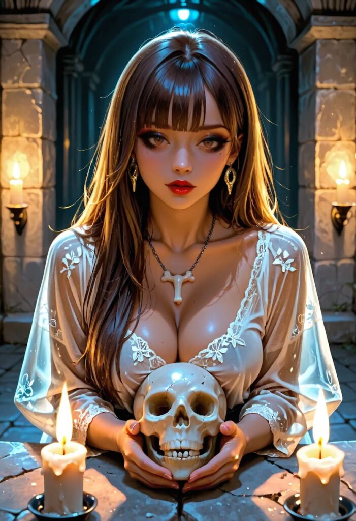 front-laced transparent, (filmy silk blouse:1.2), cleavage, holding skull,