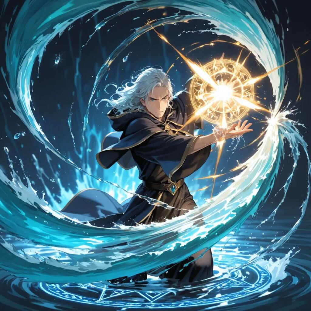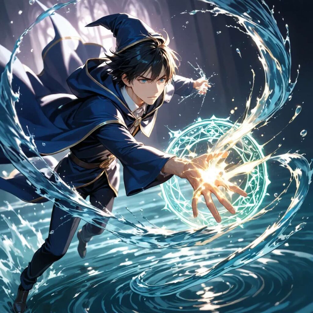 - Prompt:1boy, wizard, casting spell, dynamic pose, (water vortex forming around hand:1.4), water element, splash, droplets, magic circle, intense energy.